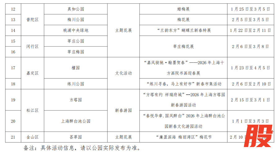 丙午马年即将到来,沪上公园将推出21场迎新春活动,包括主题花展、新春游园、文化活动三大类,重点突出“马”的主题和年味元素,内容涉及新春赏花、文展迎新、非遗体验、文艺演出等,营造喜庆的节日氛围。